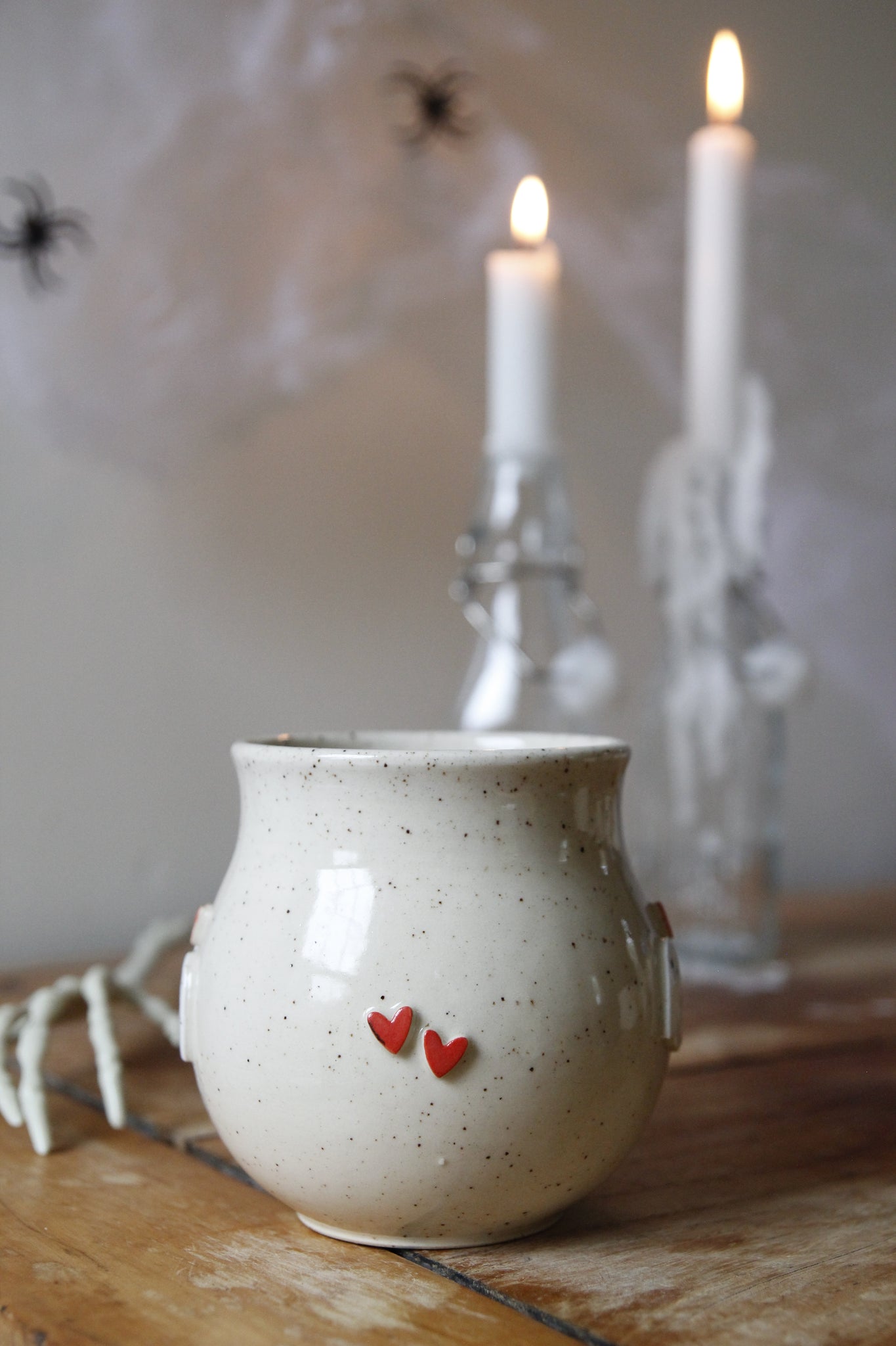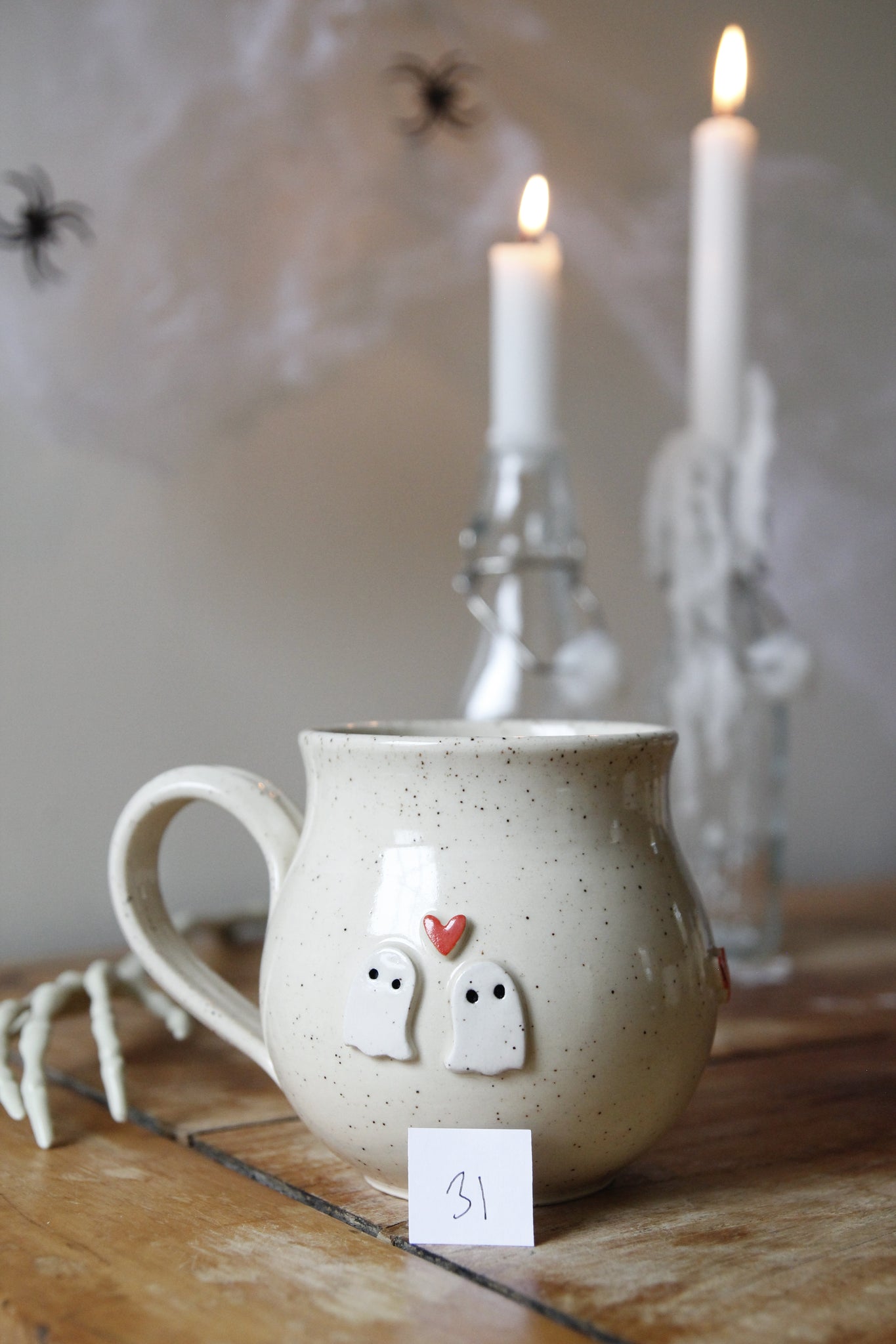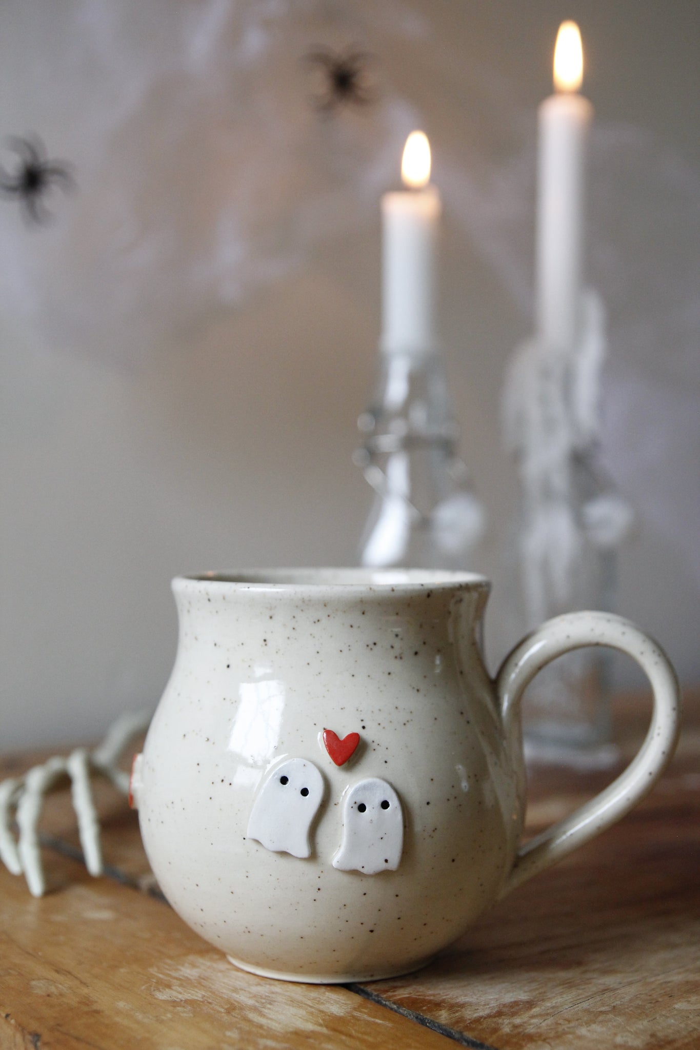 Wheel thrown mug with hand painted, Halloween themed embossed decals.