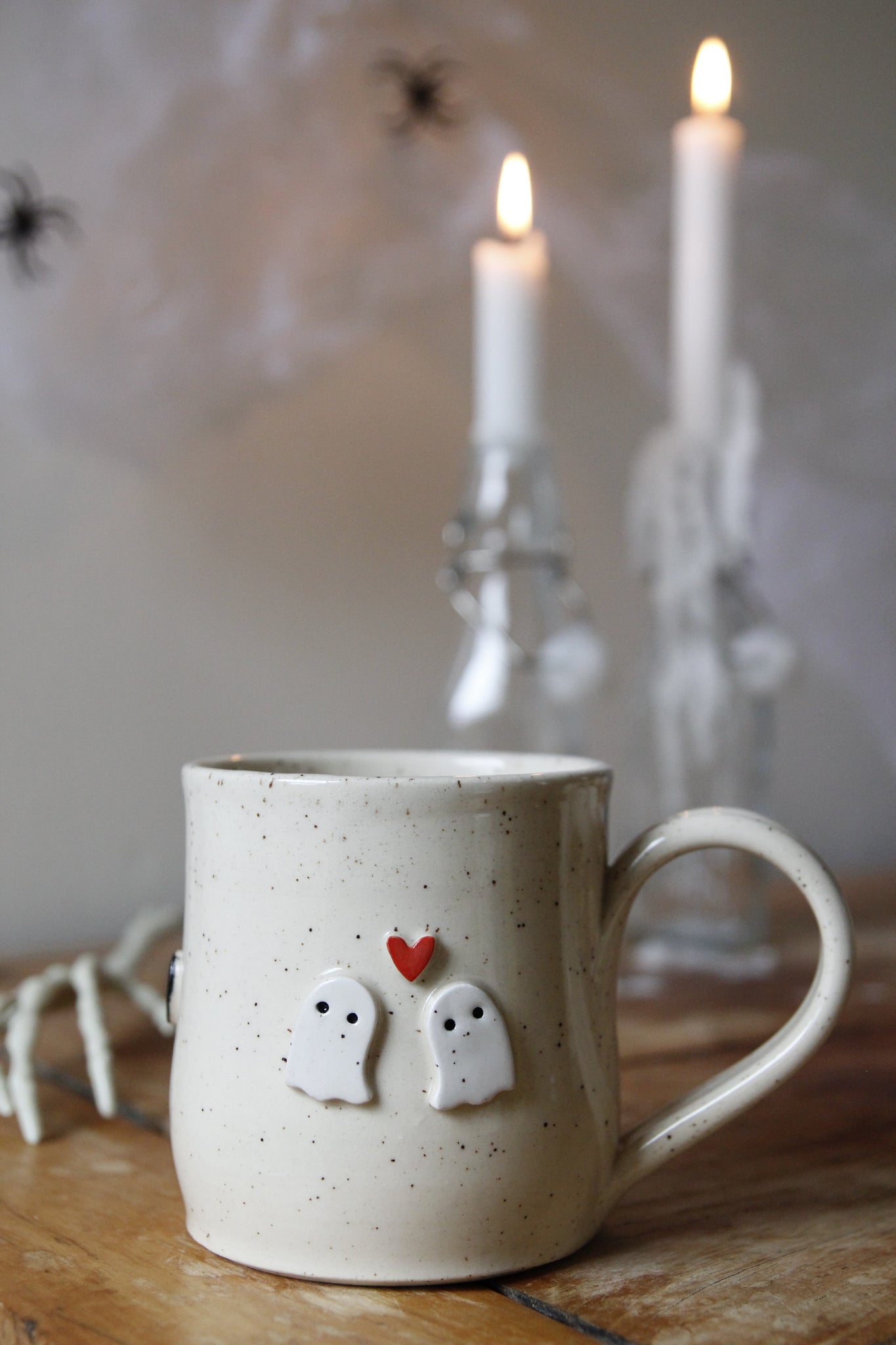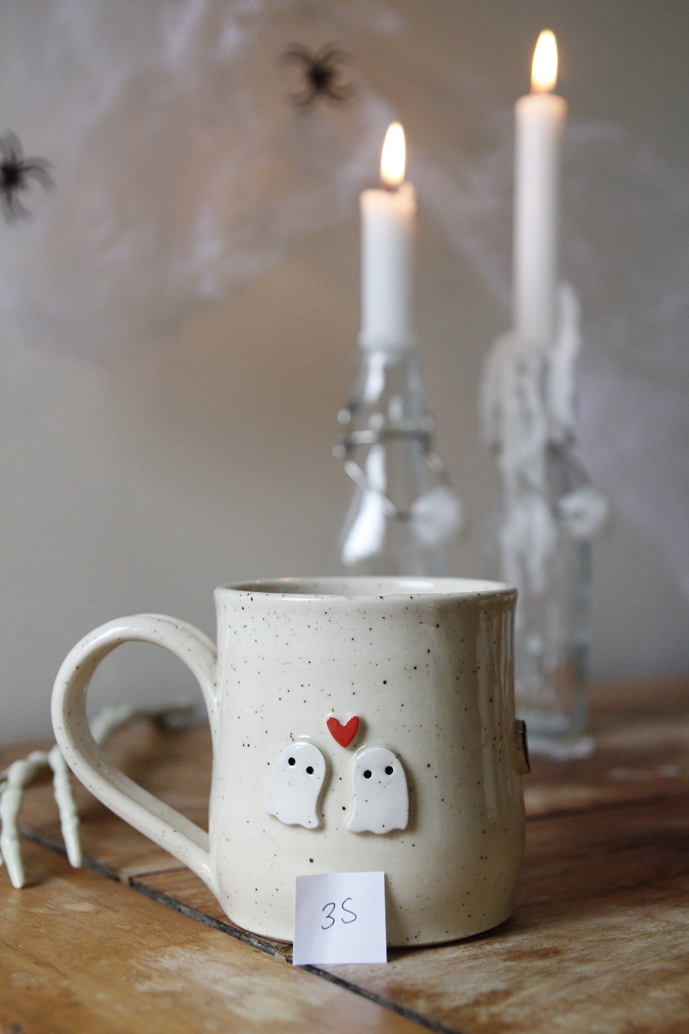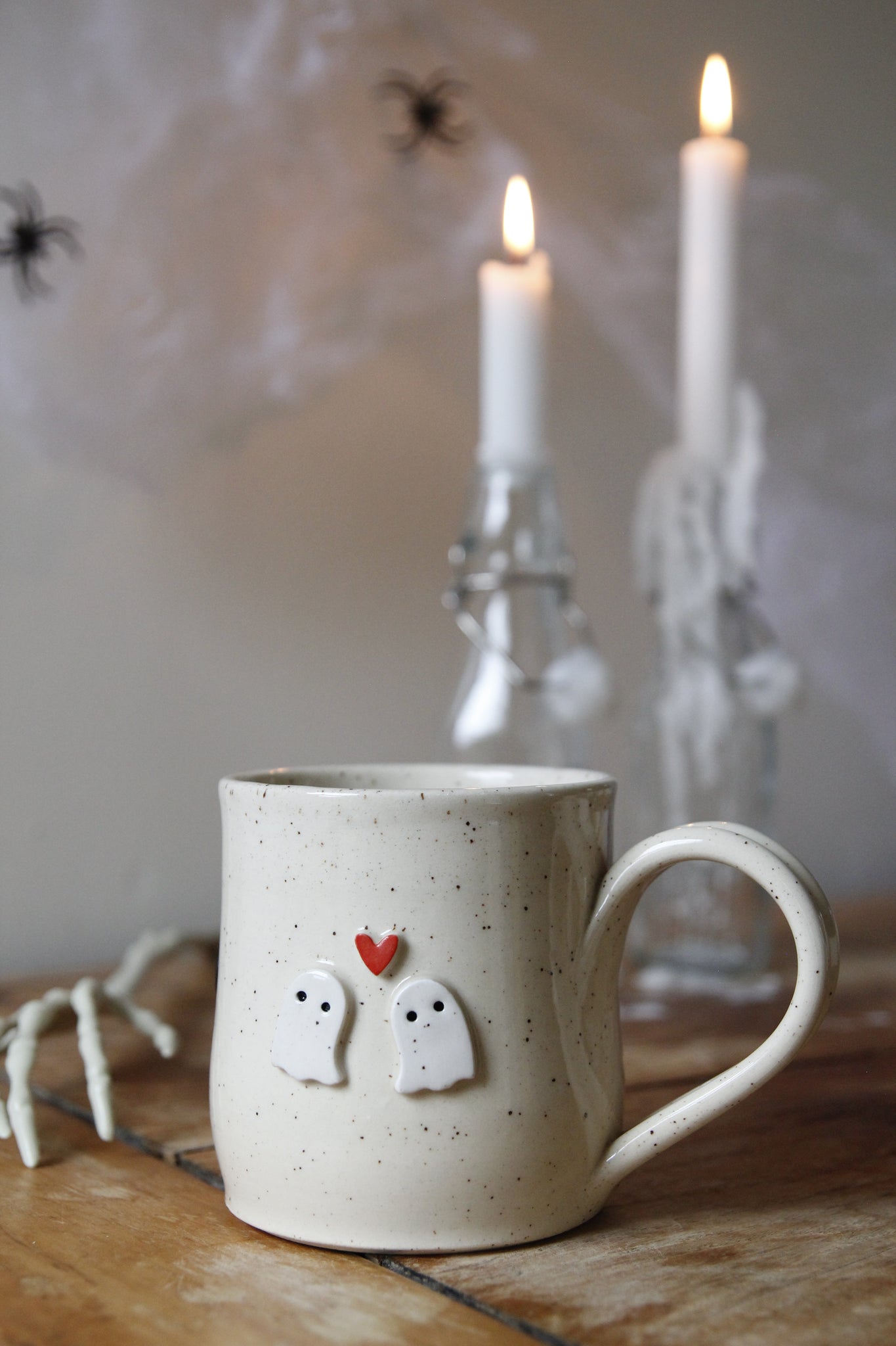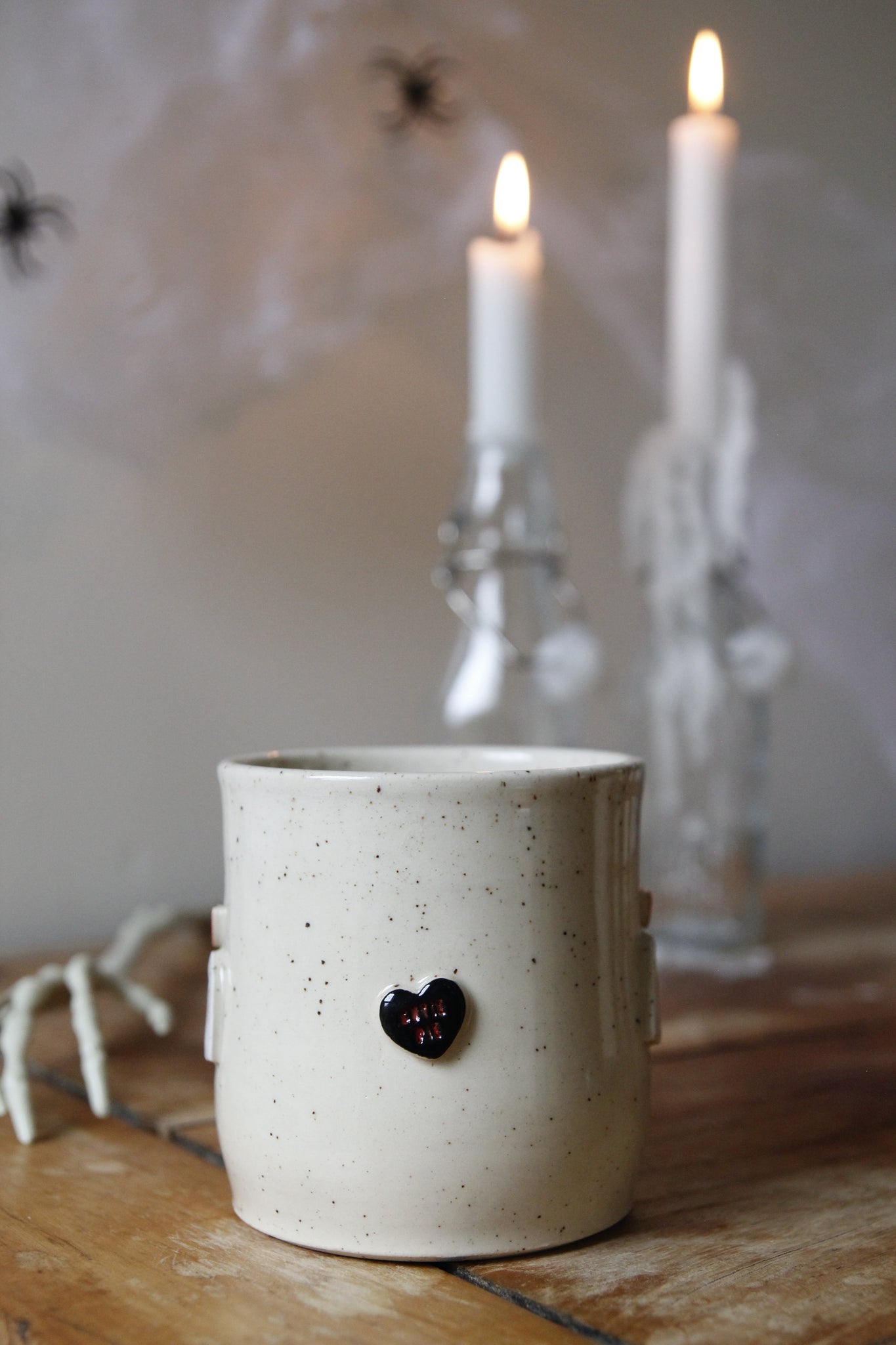 Wheel thrown mug with hand painted, Halloween themed embossed decals.