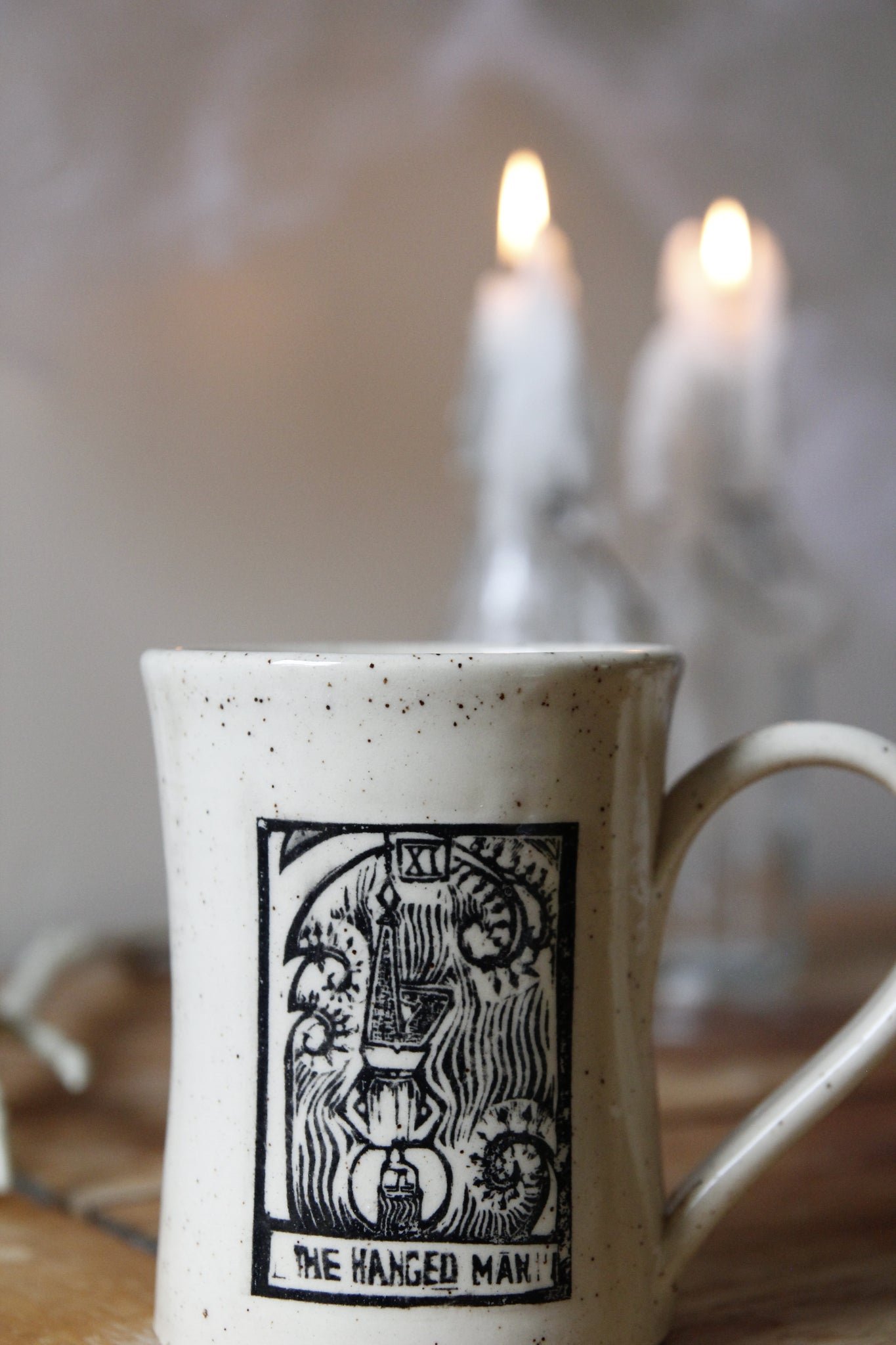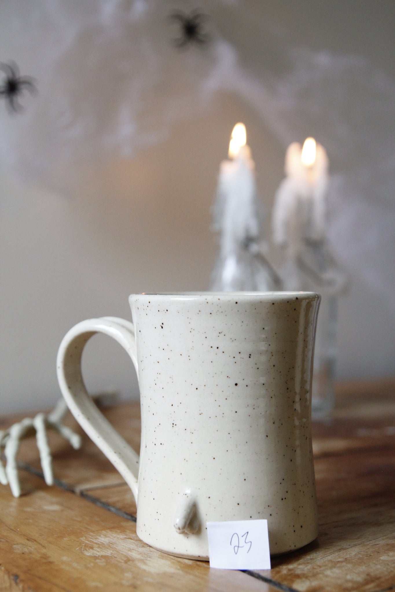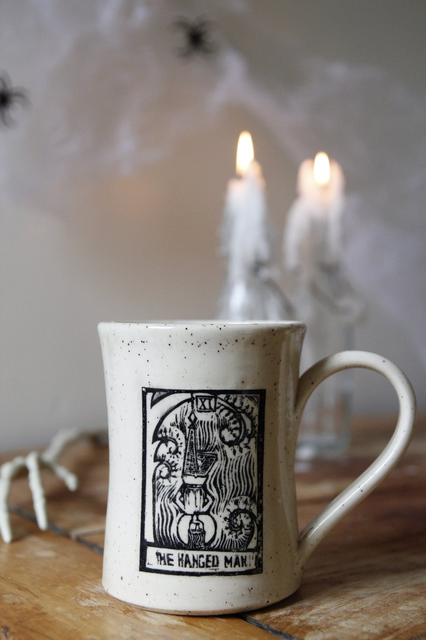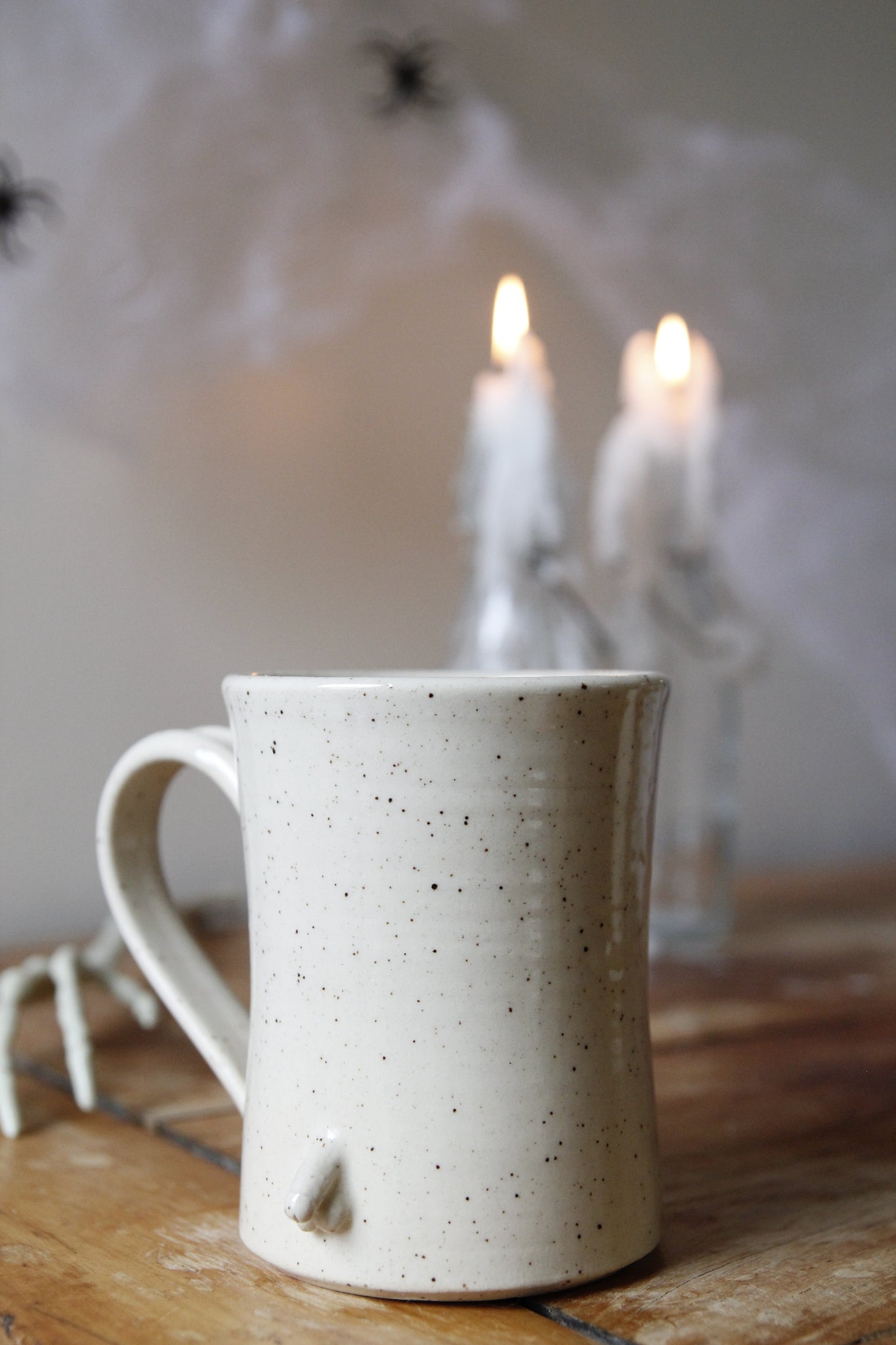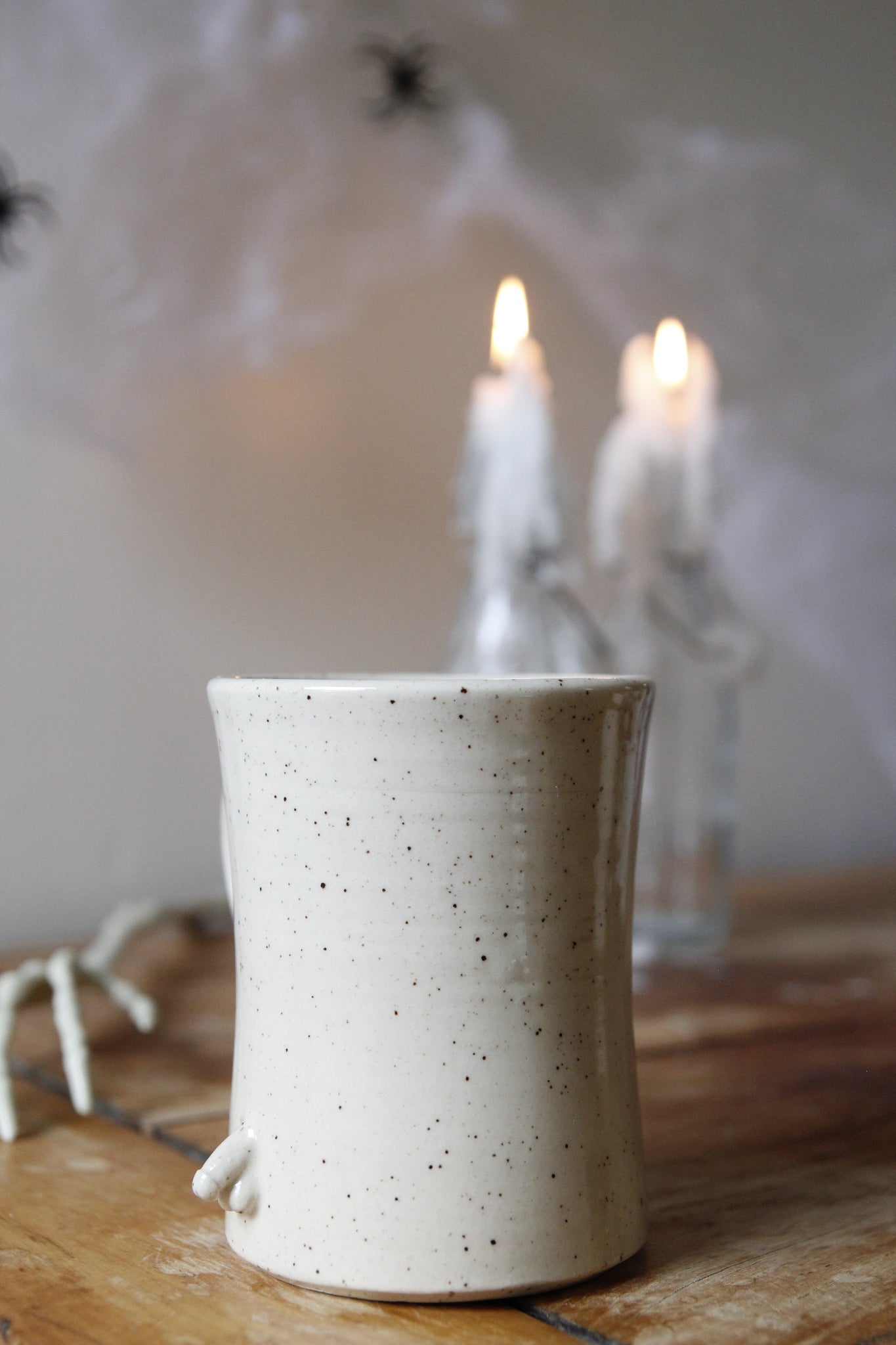 Wheel thrown mug with hand painted, Halloween themed embossed decals.