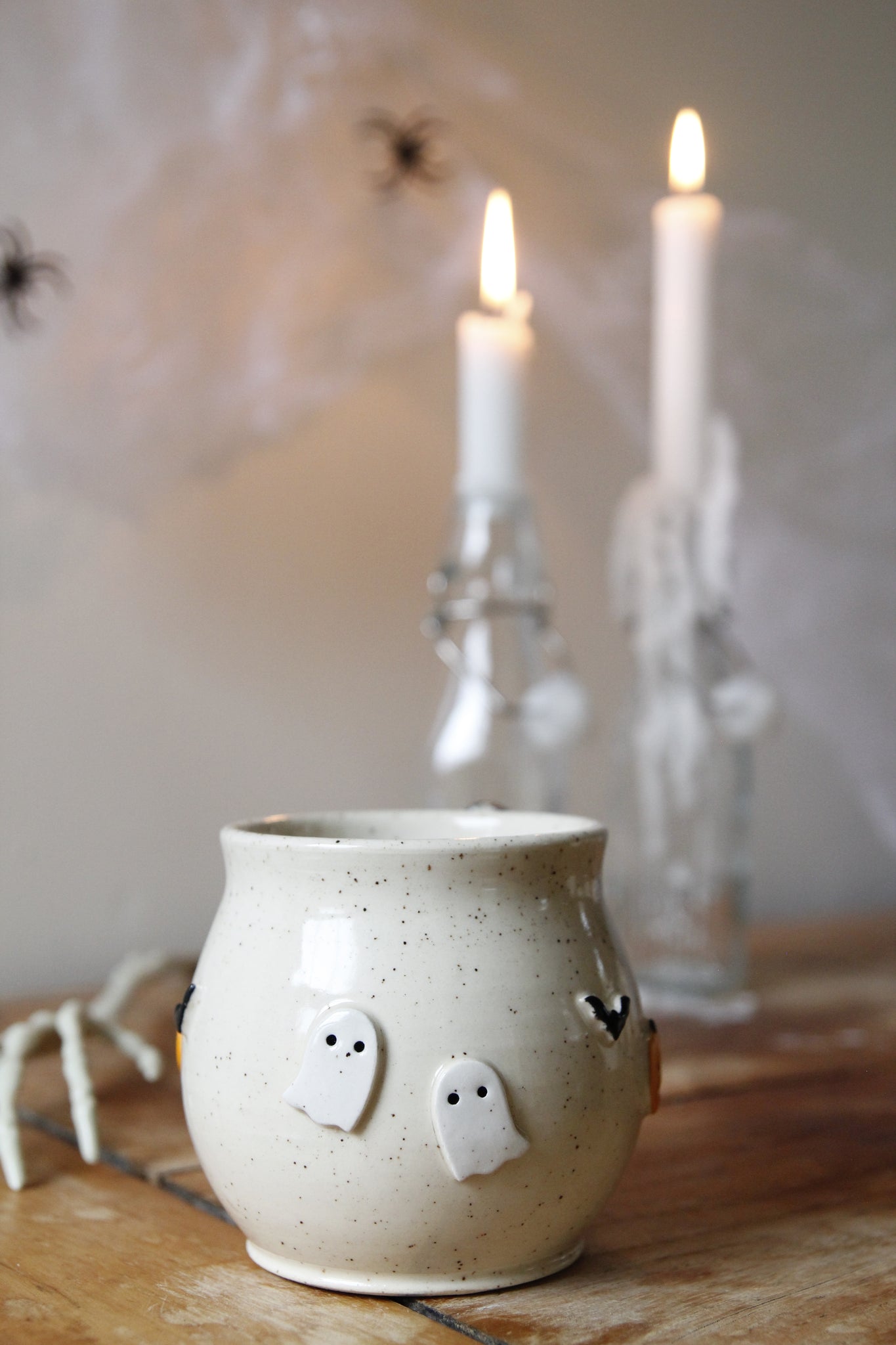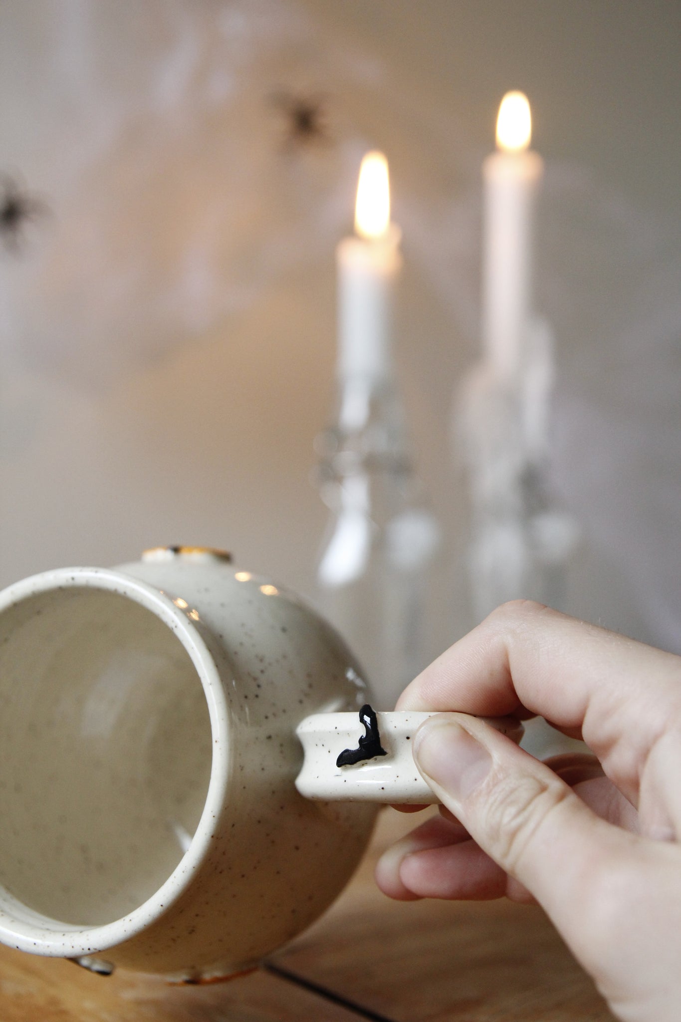 Wheel thrown mug with hand painted, Halloween themed embossed decals.