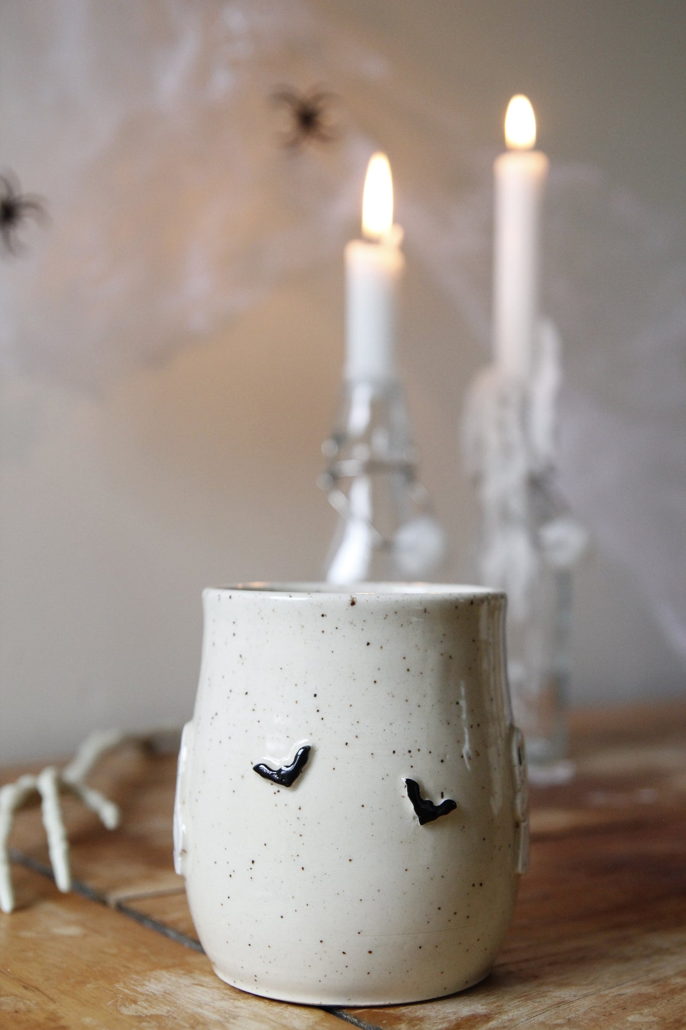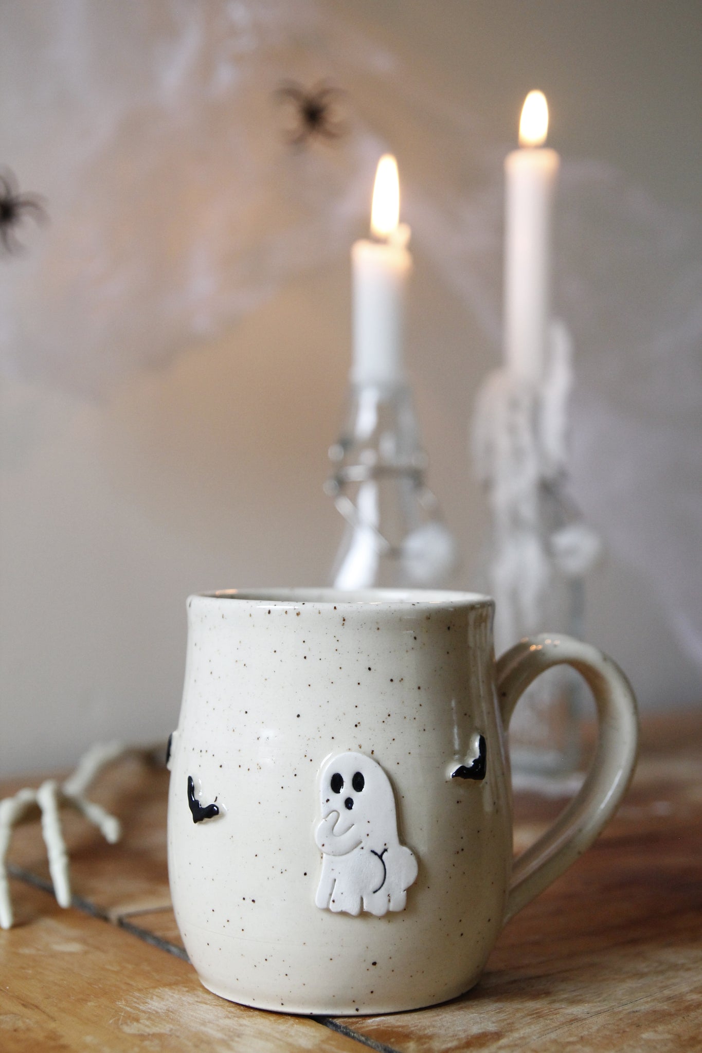 Wheel thrown mug with hand painted, Halloween themed embossed decals.
