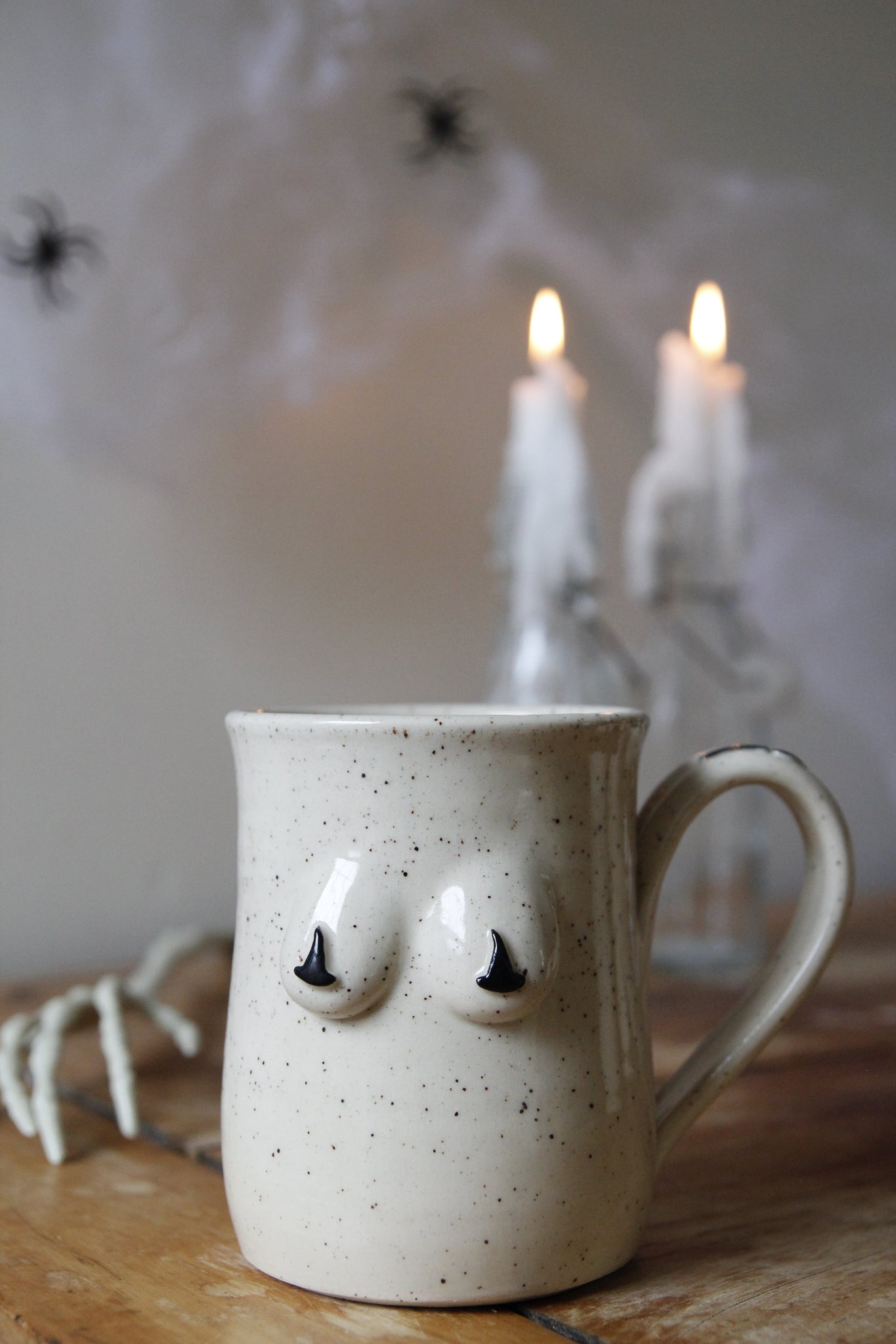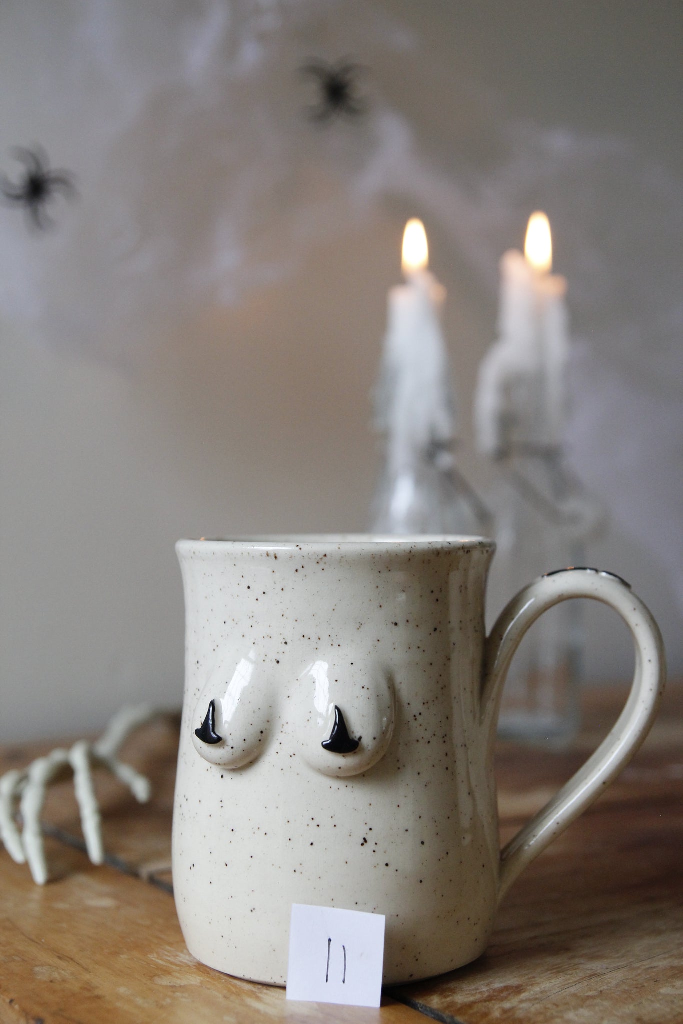 Wheel thrown mug with hand painted, Halloween themed embossed decals.