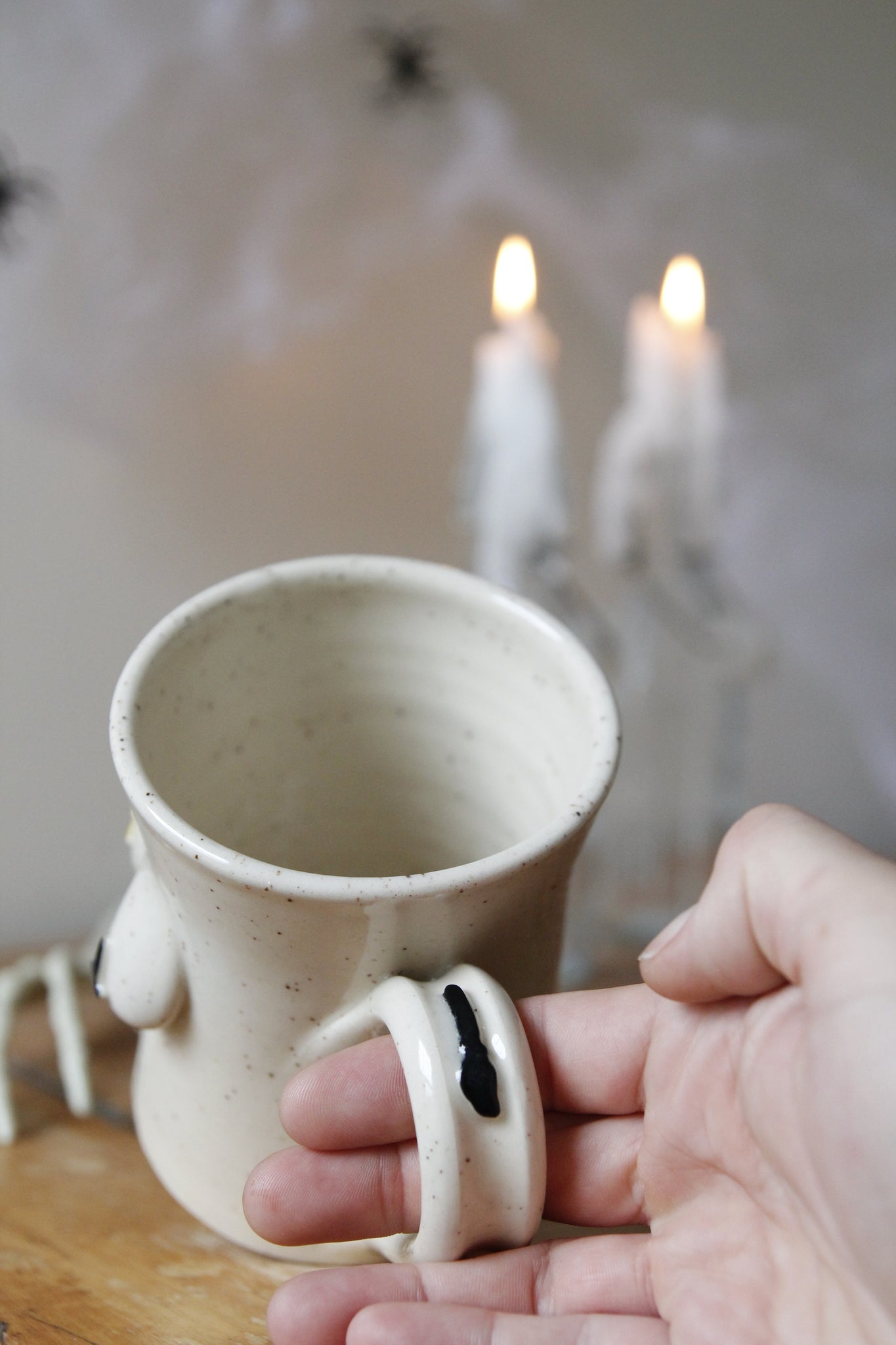 Wheel thrown mug with hand painted, Halloween themed embossed decals.