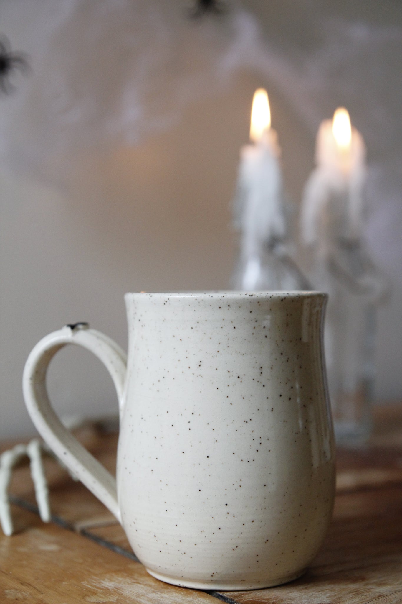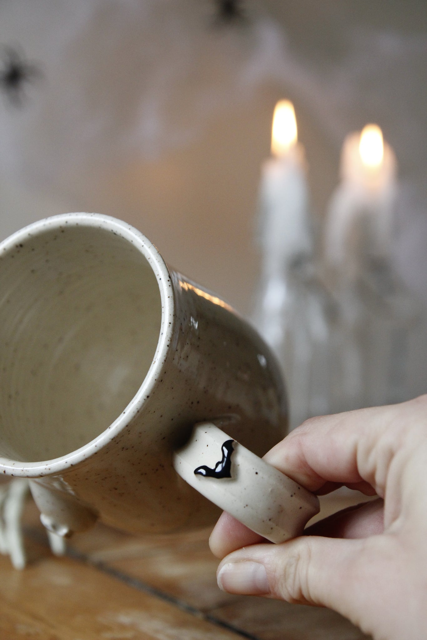 Wheel thrown mug with hand painted, Halloween themed embossed decals.