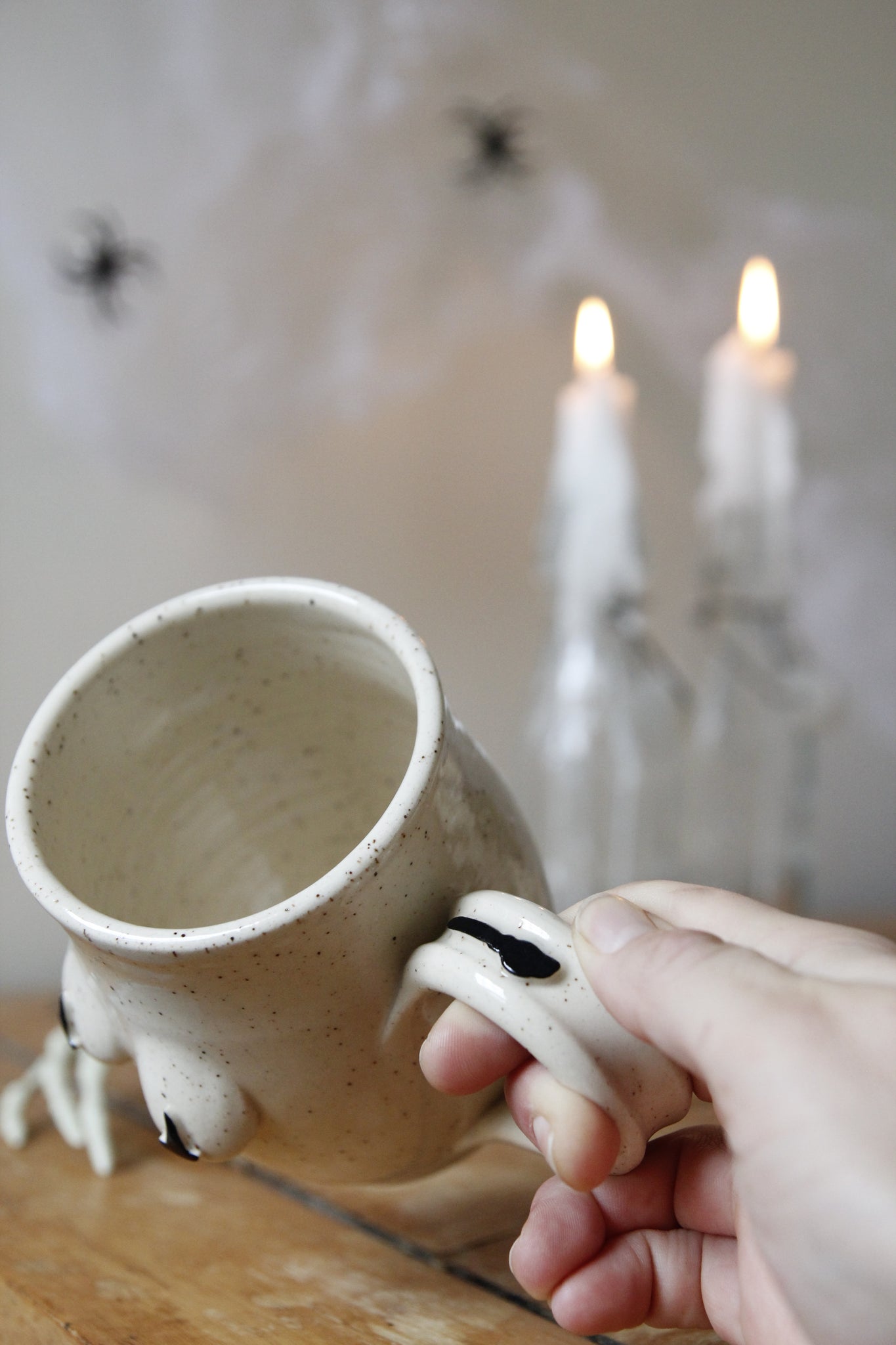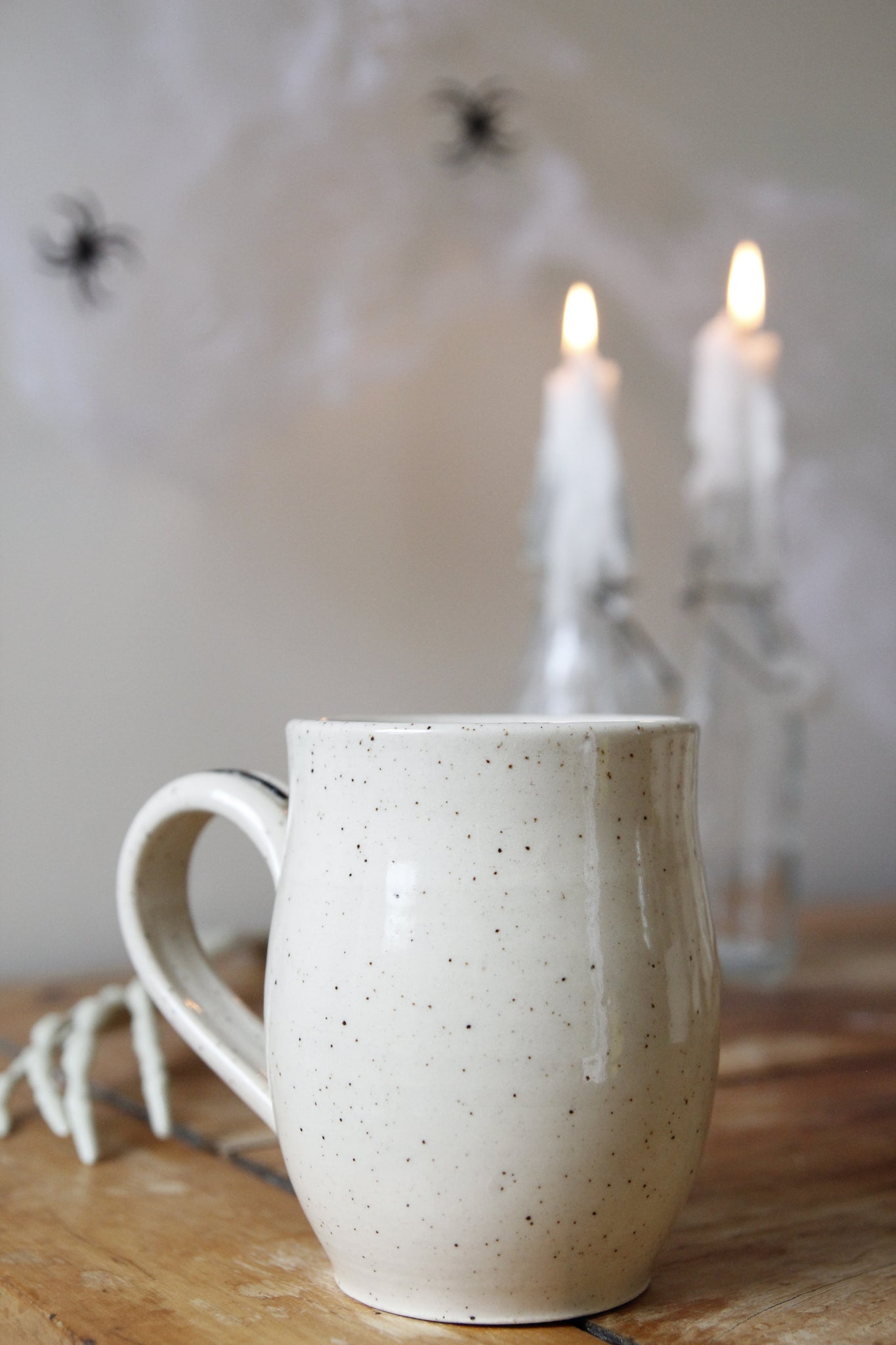 Wheel thrown mug with hand painted, Halloween themed embossed decals.